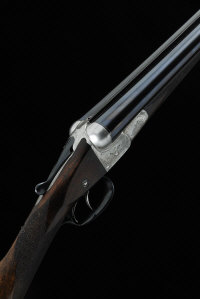 30-inch barrels with 2 3/4-inch chambers about full choke borings, machined rib with crossbolt extension, the frame engraved with fine scrolls and scenes of game, non-automatic side safety, 14 1/4-inch well figured stock, 7lb. 6oz., nitro re-proof, canvas case