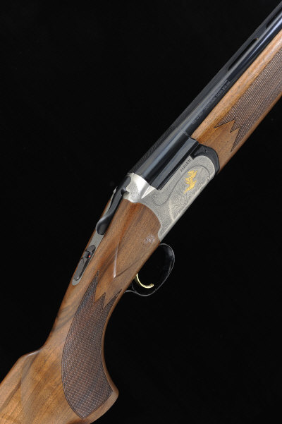FABARM A 12-BORE "ELOS DELUXE" MODEL SINGLE TRIGGER OVER AND UNDER EJECTOR GUN, NO. E22482 28 1/4-inch monobloc barrels with 3-inch chambers, tapered bores, with interchangeable tubes, machined ventilated rib, the rounded frame and top lever with scroll engraving surrounding scenes of gold game birds in flight, selective single trigger, 14 1/2-inch figured stock with pistol grip and rubber recoil pad, 7lb. 10oz., Italian nitro proof, in its maker's carton with spare chokes, etc S2 The gun appears new and unused. |