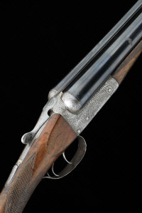 30-inch barrels with 2 1/2-inch chambers about true cylinder and 3/4 choke borings, top extension, the frame with scroll engraving, 14 1/2-inch figured stock with ribbed butt plate, 6lb. 10oz., nitro proof