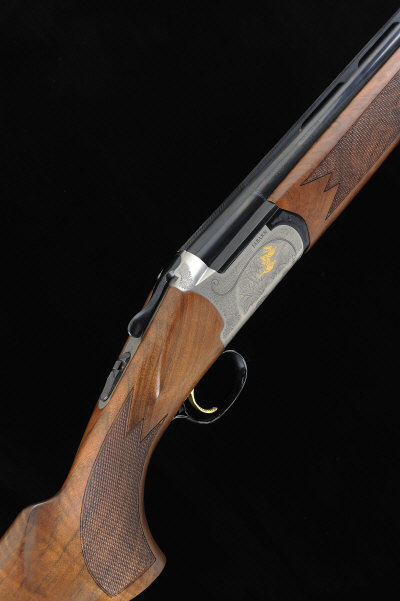 FABARM A 12-BORE "ELOS DELUXE" MODEL SINGLE TRIGGER OVER AND UNDER EJECTOR GUN, NO. E22486 30-inch monobloc barrels with 3-inch chambers, tapered bores, with interchangeable choke tubes, machined ventilated rib, the rounded frame with scroll engraving around scenes of gold game birds, selective single trigger, 14 1/2-inch figured stock with pistol grip and rubber recoil pad, 7lb. 6oz., Italian nitro proof, in its maker's carton with spare chokes, etc S2 The gun appears new and unused. |
