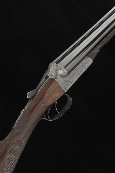 JOHN DICKSON & SON A 12-BORE BOXLOCK NON-EJECTOR GUN, NO. 5118 28-inch sleeved barrels with 2 1/2-inch chambers, about 1/4 and 1/2 choke borings, mid extension, the frame and top lever with fine scroll engraving, the maker's name signed within a scrolling banner, 14 1/4-inch well figured stock, 6lb. 10oz., nitro proof, in its maker's leather case S2 The maker confirms that the gun was built in 1899. |