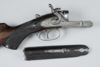 31-inch damascus barrels with 2 3/4-inch chambers about true cylinder and 1/4 choke borings, doll's head extension, the frame, rebounding bar locks, hammers and patent top lever with fine scroll engraving entwined around scenes of water fowl, 13 3/4-inch figured stock with pistol grip and skeleton butt plate, 9lb., barrel wall thickness well below recommended minimum