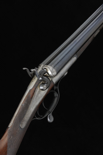 28-inch sleeved barrels with 2 1/2-inch chambers, about improved cylinder and 1/2 choke borings, the rounded frame, non-rebounding back locks, hammers and rotary underlever with scroll engraving, 14 1/2-inch replacement stock, 6lb. 15oz., nitro proof