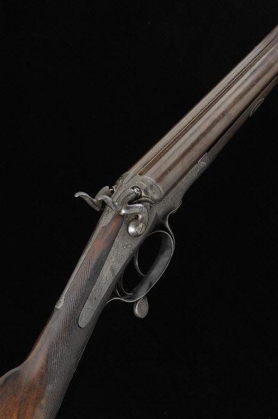 THOMAS BOSS & CO. A 14-BORE HAMMER GUN, NO. 1780 28-inch damascus barrels with 2 1/2-inch chambers, about true cylinder borings, the rounded frame, single bite rotary underlever, rebounding backlocks and hammers with scroll engraving, 14-inch figured stock with steel butt plate, 6lb. 2oz., black powder proof, bores pitted, in its maker's leather case S58 The maker confirms that the gun was built in 1860 and was subsequently converted from pinfire to centrefire. |