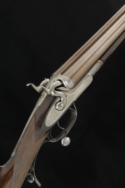 27-inch shortened damascus barrels with 2 1/2-inch chambers, about improved cylinder and 1/4 choke borings, file-cut flat top rib engraved "Makers to Their Royal Highnesses The Prince of Wales and The Duke of Edinburgh", the frame, rebounding bar locks, hammers and rotary underlever with fine scroll engravin, the maker's name signed within a scrolling banner, 14 3/4-inch well figured stock with chequered butt plate, 7lb., black powder proof, bores lightly marked and pitted, left barrel wall thickness below the recommended minimum