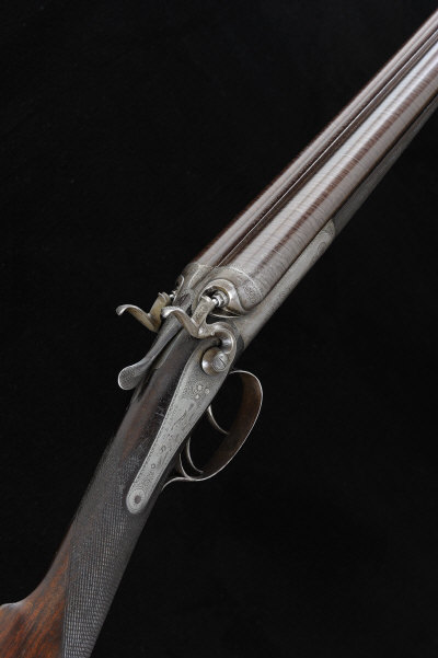 G. E. LEWIS A 16-BORE TOP LEVER HAMMER GUN, NO. 8485 29-inch damascus barrels with 2 1/2-inch chambers, about 1/4 and 3/4 choke borings, the rounded frame, hammers, rebounding back locks and top lever with border and scroll engraving around scenes of dogs, retaining faint traces of original hardening colour, 14 1/4-inch figured stock with chequered butt plate, 6lb. 6oz., nitro re-proof S2 |