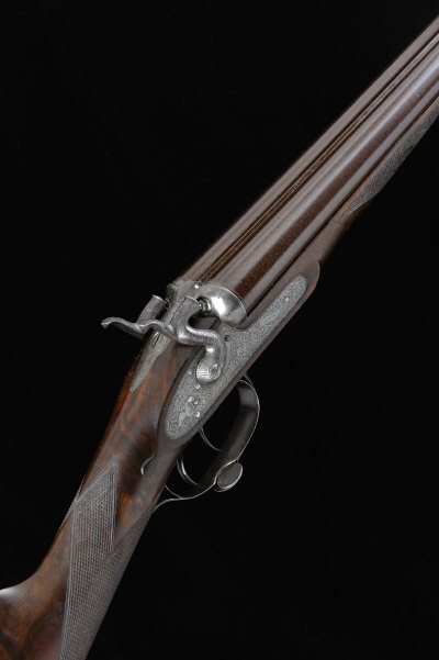 29 1/2-inch damascus barrels with 2 1/2-inch chambers, about improved cylinder borings, the frame, rebounding bar locks, hammers and push-down underlever with foliate scroll engraving entwined around dogs and rabbits, linked fore-end, 15-inch well figured replacement stock and fore-end wood, 6lb. 6oz., nitro re-proof