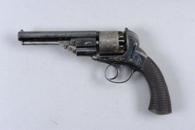 WHITTON & DAW A SCARCE PERCUSSION DOUBLE ACTION REVOLVER, NO. 2029 5-inch octagonal barrel with loading lever, 6-shot cylinder, the frame with border and scroll engraving and retaining much of its original blued and colour-hardened finish, chequered walnut grip with cap, London black powder proof