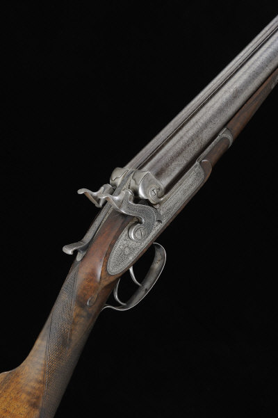THOMAS HORSLEY A 12-BORE BAR-IN-WOOD PATENT HAMMER GUN, NO. 2122 30-inch damascus barrels with 2 1/2-inch chambers, about true cylinder borings, the frame, rebounding back locks, hammers and sliding top lever with fine scroll engraving, self retracting strikers and loaded indicators, 14 1/4-inch figured stock with ribbed butt plate, 7lb., black powder proof (1868 Rules) S2 The gun incorporates the three classic Horsley patents, namely the slide-back top lever, the loaded indicators and the self-retracting strikers. Although in this instance, as the locks have been converted to rebounding, this feature has been disconnected. |