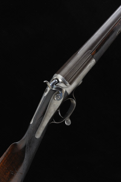 WILLIAM POWELL & SON AN 8-BORE SINGLE BARREL HAMMER GUN, NO. 4747 34-inch damascus barrel with 3 1/4-inch chamber, about cylinder boring, the rounded frame, non-rebounding back lock, hammer and rotary underlever with border engraving, 15-inch well figured stock with ribbed butt plate, fore-end wood repaired, 8lb. 8oz., nitro re-proof S58 |