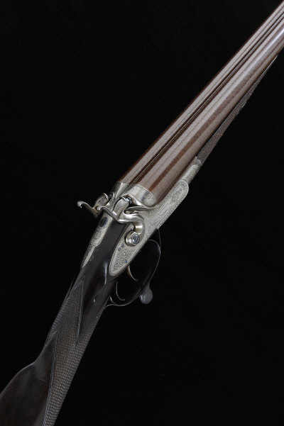 BECKWITH A 12-BORE HAMMER GUN, NO. 4021 30-inch barrels with 2 1/2-inch chambers, about improved cylinder and 1/4 choke borings, the frame, non-rebounding bar locks, hammers and rotary underlever with scroll engraving around scenes of game, 14 1/2-inch figured stock with engraved heel and toe plates, 7lb. 8oz., nitro re-proof S2 |