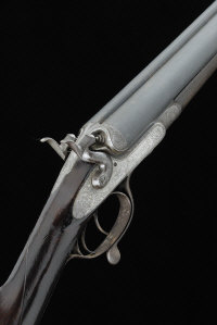 The gun is unusual in having Parson's patent (201 of 1868) chopper-lump barrels, each tube being stamped with their patent use number and hammer symbol. |