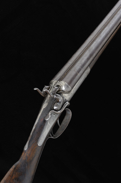 STEPHEN GRANT A 12-BORE PATENT SIDE LEVER HAMMER GUN, NO. 3879 30-inch damascus barrels with 2 1/2-inch chambers, about 1/2 and 3/4 choke borings, the rounded frame, rebounding back locks, hammers and side lever with fine scroll engraving, Grant & Hodges patent action, 14-inch figured stock with heel and toe plates, 6lb. 10oz., nitro proof, bores severely dented, worn overall, in its maker's brassbound oak and leather case |