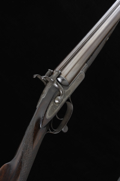 30-inch damascus barrels with 2 1/2-inch chambers, about true cylinder borings, the frame, non-rebounding bar locks, hammers and rotary underlever with fine scroll engraving and retaining traces of original finish, 14 1/4-inch figured stock with steel butt plate, toe chipped, 6lb. 10oz., black powder proof