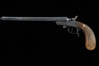 A BELGIAN .410 DOUBLE BARREL HAMMER PISTOL, NO. 4120 10-inch barrels with 2-inch chambers, the frame with push-back catch, chequered grip, Belgian nitro proof