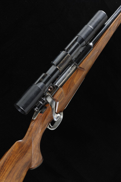 DAVID LLOYD A .264 MAGNUM BOLT-ACTION SPORTING RIFLE, NO. 227 24-inch barrel, the Mauser 98 receiver with integral telescopic sight, bolt with side safety, the magazine with hinged base plate, half length highly figured stock with pistol grip, cheekpiece and recoil pad, 13 1/2-inch pull, 8lb. 8oz., nitro proof S1 |