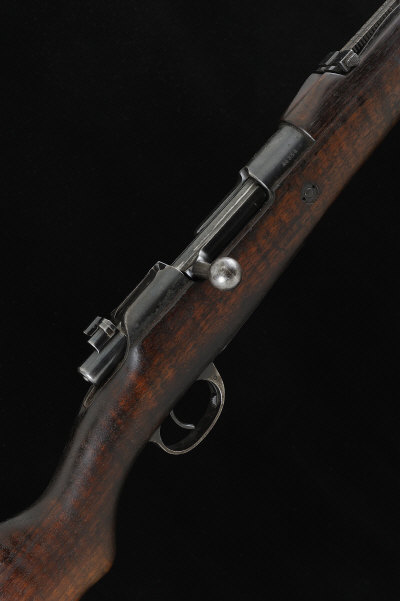 24-inch barrel with ramp fore sight, tangent rear sight graduated to 2000, receiver ring with Portuguese crown, bolt with side safety, the full length stock with hand guard and steel furniture, 12 1/4-inch pull, 8lb. 1oz.. nitro proof