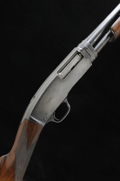 WINCHESTER A .410 MODEL 42 TAKE-DOWN PUMP-ACTION GUN, NO. 24019 26-inch barrel with 3-inch chamber, about 1/4 choke boring, the three-quarter length magazine tube restricted to two-shot, plain frame with machined top surface and retaining some original finish, 13 3/4-inch figured stock with straight hand and maker's butt plate, 5lb. 15oz., nitro proof S2 |