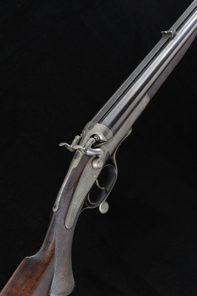 ALEX HENRY A .450/.400 (2 3/8-INCH) HAMMER RIFLE, NO. 6280 26-inch barrels with file-cut rib, rear sight with folding leaf, doll's head extension, the rounded frame, rebounding back locks, hammers and rotary underlever with fine scroll engraving and retaining traces of original hardening colour, the maker's name signed within a scrolling banner, 14 1/2-inch well figured stock with pistol grip and engraved heel and toe plates, sling eyes, 7lb. 6oz., black powder proof S58 |