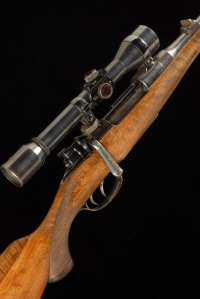 AN AUSTRIAN 7X57 BOLT ACTION SPORTING RIFLE, NO. 38/71 24-inch barrel with ramp foresight and fixed rearsight, receiver mounted with a Ajack telescopic sight, bolt with flag safety and engraved handle, double set triggers, magazine base plate engraved with scrolls and a deer in a woodland scene, full length stock with pistol grip and later raised comb, 13 1/4-inch pull, 7lb. 15oz., nitro proof |