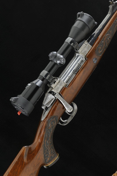 MANNLICHER SCHOENAUER A .270 MODEL M72 BOLT-ACTION SPORTING RIFLE, NO. 9768 23 1/2-inch barrel with ramp fore sight and fixed rear sight, the receiver mounted with a Zeiss Diatal-C 4x32 telescopic sight in quick-detachable swing-off mount, the receiver magazine floor plate engraved with oak leaves surrounding scenes of running deer, bolt with swing safety, double set trigger, the well figured half length stock with carved panels, pistol grip, cheekpiece and rubber recoil pad, 14 1/4-inch pull, sling swivels, 8lb. 7oz., Austrian nitro proof S1 |