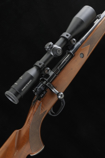 22 1/2-inch barrel with ramp fore sight and folding rear sight, the receiver mount with a Schmidt & Bender 6x42 Klassik telescopic sight, bolt with side safety, magazine with hinged base plate, the half length stock with pistol grip, cheekpiece and maker's butt plate, 13 3/4-inch pull, 8lb. 6oz.. nitro proof