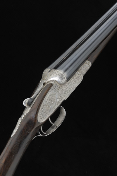 CHARLES HELLIS & SON A 12-BORE SIDELOCK EJECTOR GUN, NO. 3148 28-inch barrels with 2 1/2-inch chambers, about 1/4 and full choke borings, top extension, the frame, locks and top lever with bolt scroll engraving, the maker's name signed within a banner, 14-inch figured stock including 1/2-inch ribbed ebonite extension, 6lb. 6oz.. nitro re-proof, right bore marginal, left barrel wall thickness below the recommended minimum S2 |