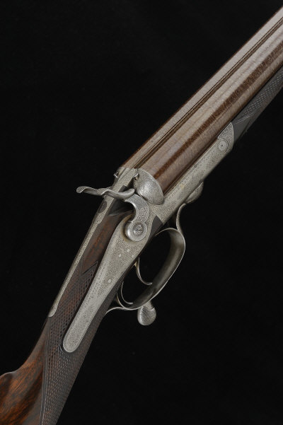 28 3/4-inch (possibly shortened) barrels with 2 1/2-inch chambers, about improved cylinder borings, the rounded frame, non-rebounding noseless hammers, backlocks and rotary underlever with fine scroll engraving, 14 1/2-inch well figured stock with engraved heel and toe plates, 7lb. 2oz., black powder proof (1868 Rules), re-jointing recommended