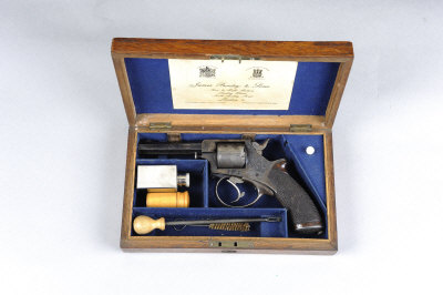 J. PURDEY A .32 RIMFIRE TRANTER'S PATENT REVOLVER, NO. 9307 4-inch octagonal barrel with retailer's address, the solid frame with loading gate and with fine scroll engraving, chequered walnut grip, retaining some original finish overall, black powder proof, in its associated oak case, Purdey label pasted over an earlier retailer's label |