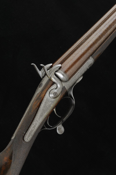 30-inch damascus barrels with 2 1/2-inch chambers, about true cylinder borings, the rounded frame, non-rebounding backlocks, hammers and rotary underlever with fine scroll engraving, 14 3/4-inch highly figured stock with engraved steel butt plate, 6lb. 13oz., black powder proof, bores marked