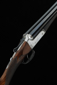 28-inch sleeved barrels with 2 1/2-inch chambers about 1/4 and 1/2 choke borings, doll's head extension, the plain frame with border decoration, the maker's name signed within a scrolling banner and in gold on the top lever, 14 1/4-inch figured replacement stock, 5lb. 8oz., nitro proof