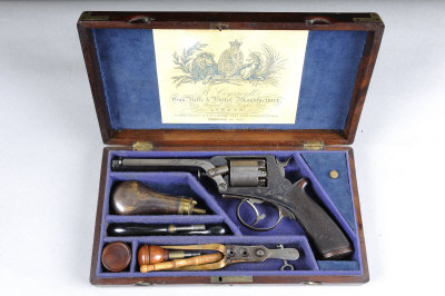 COGSWELL & HARRISON A 54-BORE TRANTER'S PATENT DOUBLE ACTION REVOLVER, NO. 9621T 6-inch octagonal barrel engraved with the retailer's name, loading lever, the solid frame with border and scroll engraving and retaining much original finish, five-shot cylinder, chequered walnut grip, black powder proof, in a re-lined case with some accessories and a reproduction label |