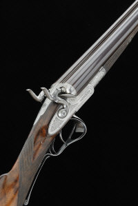 30-inch Parson's patent chopper-lump damascus barrels with 2 1/2-inch chambers about true cylinder borings, converted from pinfire, the frame, Purdey patent thumb lever, rebounding barlocks and hammers with fine scroll engraving, grip safety, 14 1/4-inch highly figured stock, 7lb., black powder proof