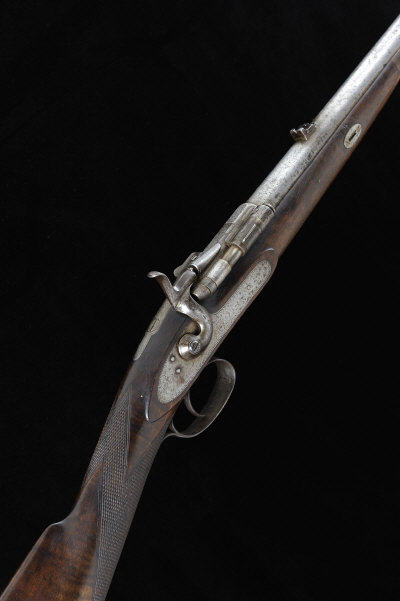 29-inch barrel with 2-inch chamber, folding leaf sights, Snider patent breech, bar lock and hammer, the half length stock with steel butt plate, 14 1/4-inch pull, 5lb. 8oz., nitro proof