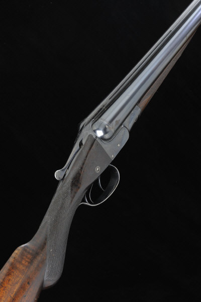 28-inch replacement barrels by the maker with 2 1/2-inch chambers, about improved cylinder and 3/4 choke borings, crossbolt extension, the frame and top lever with scroll engraving, non-automatic side safety, 14 1/2-inch figured stock with semi pistol grip and ribbed butt plate, 6lb. 10oz., nitro proof, in its leather case