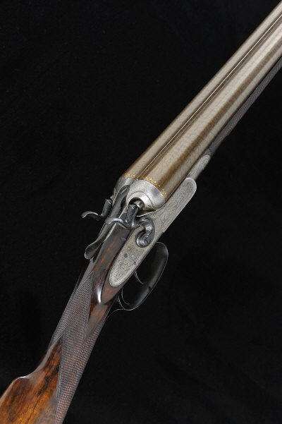 CHARLES BOSWELL A 12-BORE TOP LEVER HAMMER GUN, NO. 1907 30-inch damascus barrels with 2 1/2-inch chambers, about 3/4 choke borings, the frame, rebounding bar locks, hammers and top lever with fine scroll engraving around scenes of game, 14 1/4-inch highly figured stock with ribbed butt plate, 6lb. 7oz., nitro re-proof, left bore marked S2 |