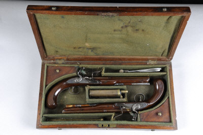 KNUBLEY A PAIR OF 20-BORE FLINTLOCK DUELLING PISTOLS 9-inch two-stage round to octagonal damascus barrels with gold lined touch holes, engraved tangs, the stepped locks engraved "Knubley", full stock with steel mounts, well re-finished overall, in their fitted mahogany case |