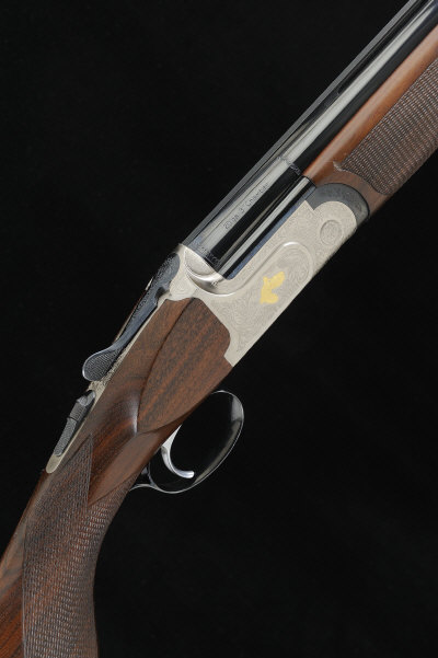 28-inch monobloc barrels with 3-inch chambers, about 1/4 and 1/2 choke borings, machined ventilated rib, the frame and top lever with scrollwork surrounding gold embellished game birds, selective single trigger, 13 1/2-inch figured stock with semi pistol grip and maker's butt plate, 5lb. 3oz., Italian nitro proof