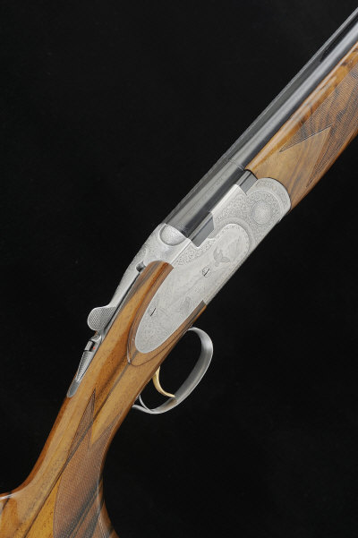 P. BERETTA A 20-BORE 687 EELL "DIAMOND PIGEON" SINGLE TRIGGER OVER AND UNDER EJECTOR GUN, NO. P45554B 28-inch monobloc barrels with 3-inch chambers, about 1/4 and 1/2 choke borings, machined ventilated rib, the frame, side plates and top lever with game scene engraving surrounded by scrolling foliage, selective single trigger, 14 3/4-inch well figured stock with ebonite heel plate, 6lb. 6oz., Italian nitro proof, in its maker's case with instructions, etc S2 The gun appears little used. |