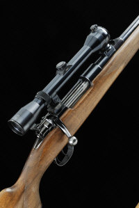 A BELGIAN 8X60 BOLT-ACTION SPORTING RIFLE, NO. 1842 25-inch barrel with ramp fore sight, rear sight with folding leaf, the Belgian 98 receiver mounted with a Tell telescopic sight with claw mount, double set triggers, half length stock with pistol grip, 14-inch pull, 9lb. 2oz., Belgian nitro proof |