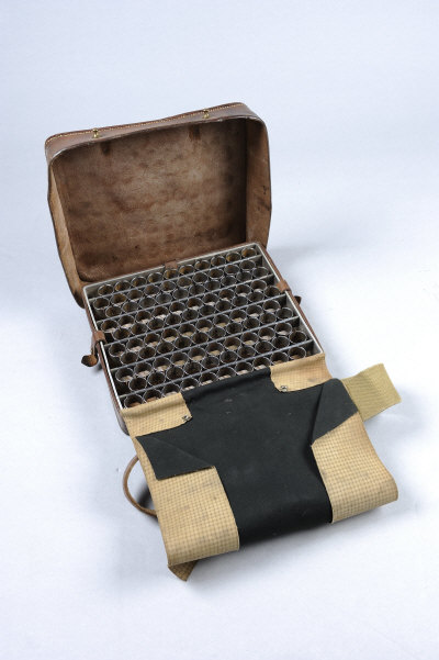 with spring clips to take 100 cases, with a rain flap, lid, straps, etc, the lid embossed E. E. G. from E. de W. W.