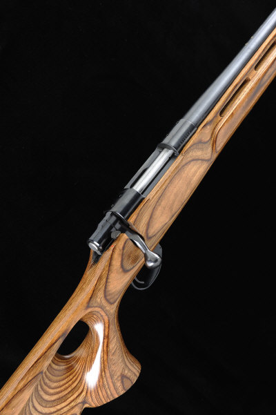 24-inch heavy barrel, bolt with side safety, magazine with hinged base plate, the half length laminated stock with pistol grip, cheekpiece and recoil pad, 13 3/4-inch pull, 9lb. 12oz., nitro proof