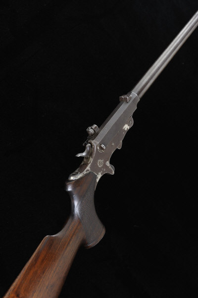 ARMY & NAVY C.S.L. A .22 SINGLE SHOT TRANTER EUREKA RIFLE, NO. 16639 25 3/4-inch tubed barrel with folding leaf sight, the breech with Lyman aperture rear sight, the frame with central hammer and retaining some of its original nickel-plated finish, 13 3/4-inch stock with pistol grip, 3lb. 14oz., nitro re-proof |