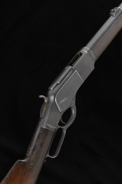 WINCHESTER A SCARCE .22 SHORT MODEL 1873 LEVER ACTION RIFLE, NO. 201508B 24 1/4-inch round barrel with raised rear sight with folding leaf, full length magazine tube, the receiver with sliding dust cover and pitted overall, 13-inch stock with steel butt plate, 8lb. 14oz., contemporary London black powder proof S1