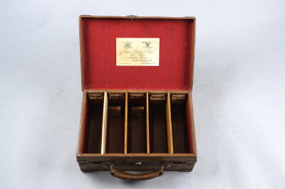A BRASSBOUND LEATHER CARTRIDGE MAGAZINE for about 250 cases, leather straps and oak dividers, one divider replaced, reproduction James Purdey & Sons label to the lid; together with a further leather box (2) |