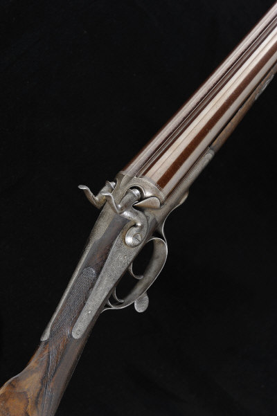 JOSEPH HARKOM & SON A 12-BORE HAMMER GUN, NO. 1216 30-inch damascus barrels with 2 1/2-inch chambers, about improved cylinder borings, the rounded frame, non-rebounding back locks, hammers and rotary underlever with fine scroll engraving, 15-inch figured stock with chequered butt plate, 6lb. 13oz., black powder proof (1868 Rules), bores pitted, barrel wall thickness well below the recommended minimum, fore-end tip missing, stock cracked at the hand S2 |