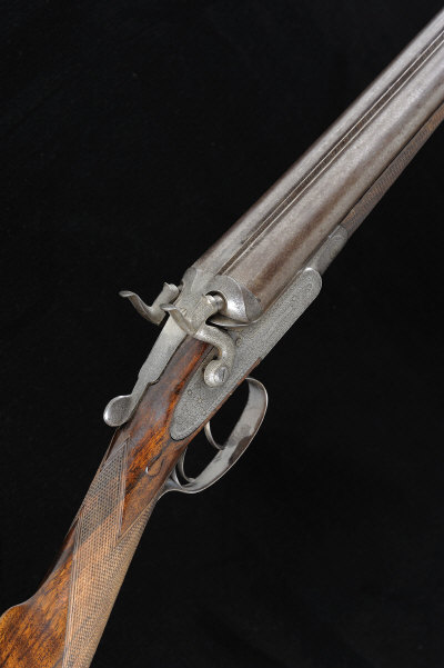 J. MACNAUGHTON A 12-BORE TOP LEVER HAMMER GUN, NO. 514 28-inch damascus barrels with 2 1/2-inch chambers, about true cylinder borings, the patent action, rebounding bar locks and top lever with fine scroll engraving, the maker's name signed within a scrolling banner, 14 1/4-inch well figured stock with engraved heel and toe caps, with old repairs at the head, 6lb. 9oz., black powder proof, bores pitted, re-jointing recommended S2 |