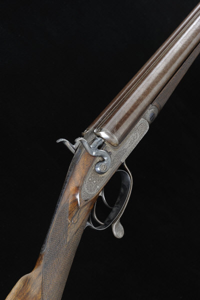 30-inch damascus barrels with 2 3/4-inch chambers, with recessed choke borings, the frame, non rebounding bar locks, hammers and rotary underlever with scroll engraving and retaining much hardening colour, the action flats signed 'Joseph Brazier, Ashes', 14 3/4-inch figured stock with steel butt plate, 7lb. 1oz., nitro re-proof