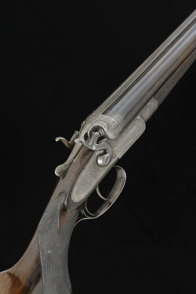 G. E. LEWIS A 20-BORE TOP LEVER HAMMER GUN, NO. 8962, CONVERTED FROM A RIFLE 26-inch barrels with 2 1/2-inch chambers, about 1/2 choke borings, file-cut rib with top extension, the frame, rebounding backlocks, hammers and top lever with fine scroll engraving and retaining faint traces of original hardening colour, 14 1/4-inch figured stock with pistol grip, cap and steel butt plate, sling eyes, 7lb. 4oz., nitro proof S2 |