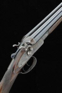 C. H. SMITH & SON A 12-BORE TOP LEVER HAMMER GUN, NO. 56 30-inch barrels with 2 3/4-inch chambers about true cylinder and 1/2 choke borings, cross-bolt extension, the frame, rebounding bar lock, hammers and top lever with border and scroll engraving and retaining much original hardening colour, 14 1/4-inch figured stock with horn butt plate, slight crack to the head, 7lb. 2oz., nitro proof |